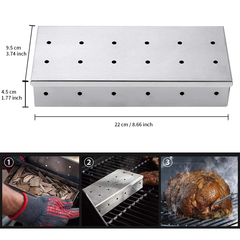 This stainless steel smoker box infuses rich smoky flavor into your grilled foods. Simply fill it with wood chips and place it on gas or charcoal grills. The durable construction withstands high heat and frequent use. Vented holes allow smoke to circulate evenly around meats and vegetables. It is perfect for adding flavors such as applewood, hickory, or mesquite. The compact design fits easily beside or on top of grill grates. Enjoy professional-level barbecue taste without special equipment. It enhances steaks, chicken, fish, and more with a delicious smoked aroma. Ideal for outdoor cooking, backyard barbecues, and weekend grilling. Elevate your grilling experience with this easy-to-use smoker box.